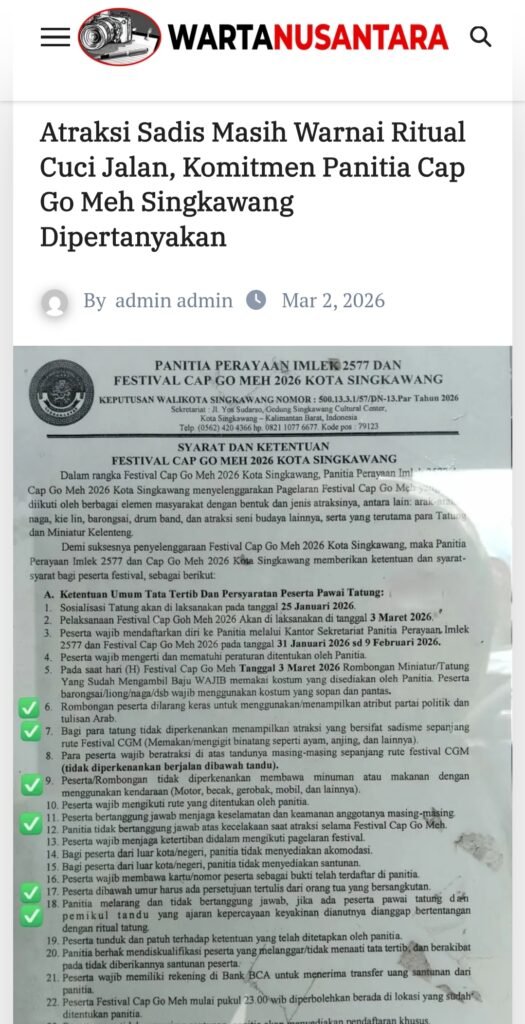 SINGKAWANG – Festival Cap Go Meh Singkawang 2026 tercoreng oleh aksi brutal oknum peserta Tatung yang mempertontonkan tindakan sadisme di hadapan publik. Meski panitia pelaksana telah menerbitkan regulasi ketat, praktik penyembelihan, menggigit, hingga menghisap darah ayam secara hidup-hidup masih ditemukan pada hari puncak perayaan, mengundang kecaman luas dari berbagai pihak.